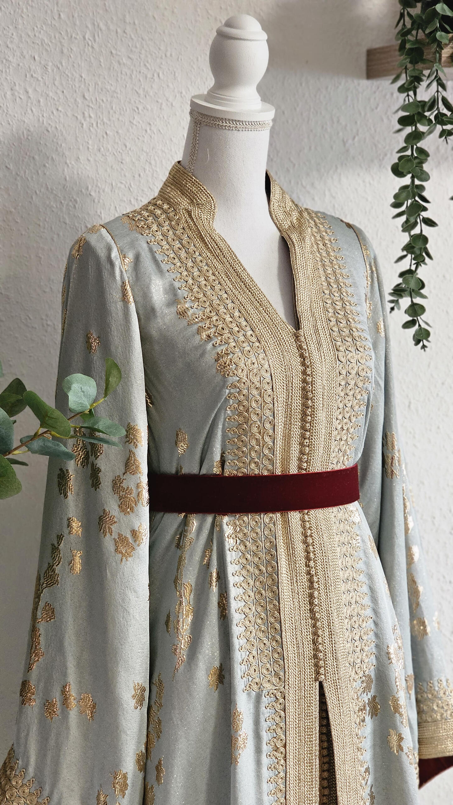 This enchanting baby blue kaftan is delicately embroidered with shimmering golden thread, designed on a soft, flowing fabric that exudes grace. The deep burgundy belt provides a bold contrast, making this piece perfect for elegant occasions with a hint of Moroccan heritage.