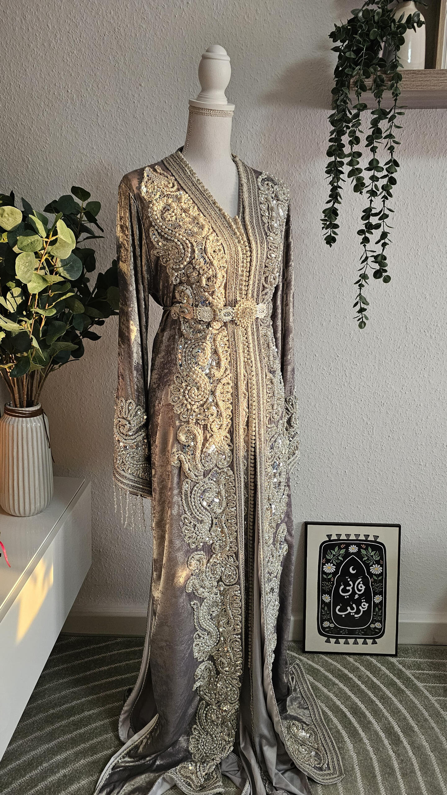 A breathtaking masterpiece adorned with rich pearl beading, shimmering sequins, and intricate embroidery. Talj, meaning “snow,” evokes the aura of winter royalty. This velvet silver-grey kaftan glistens like fresh frost, combining luxury with timeless Moroccan craftsmanship. Ideal for special occasions where elegance must speak for itself.Renting Price: 159€/Night