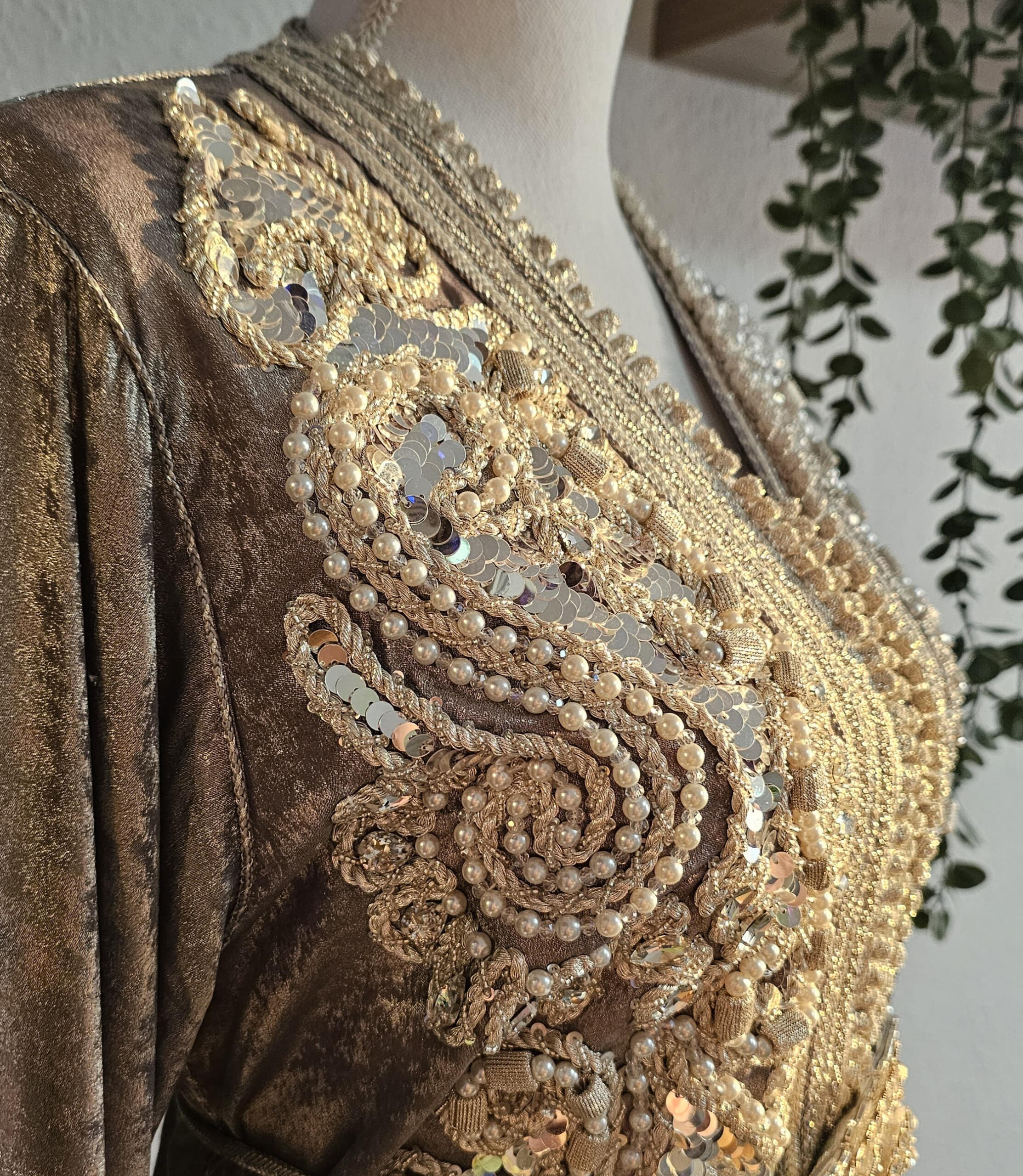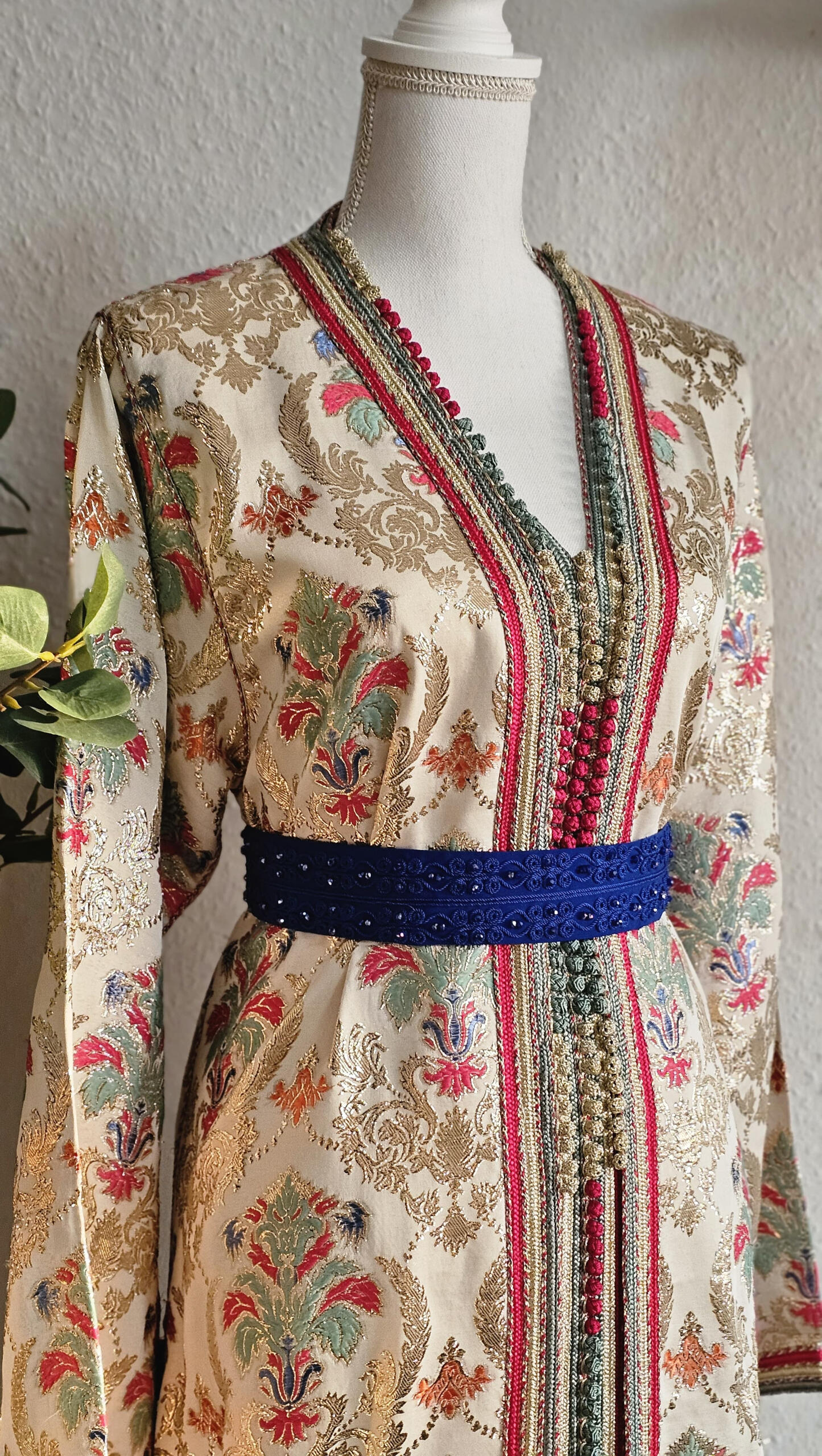 An ode to heritage and craftsmanship, Kaftan Bladi is a regal masterpiece woven with intricate floral motifs in soft gold, emerald, and coral hues. The luxurious brocade fabric shimmers subtly under light, while hand-stitched details and velvet belt evoke timeless Moroccan artistry. Ideal for formal occasions or special celebrations, this piece embodies cultural pride with refined sophistication.