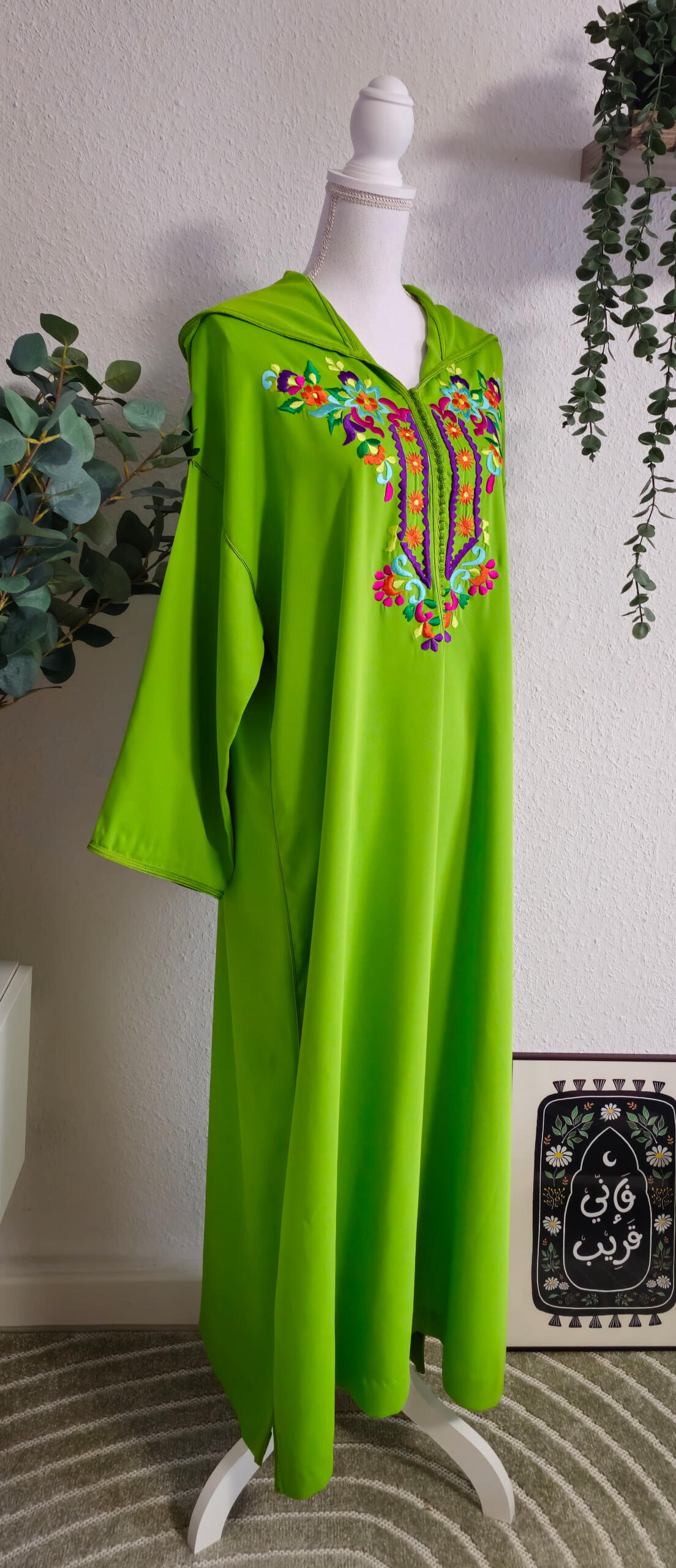 A vibrant green jellaba that blooms with color and confidence. Hand-embroidered with striking floral motifs in bold pink, violet, and ruby red, Flores evokes joy and elegance in every thread. Its lightweight flow and relaxed silhouette offer comfort without compromising on beauty — perfect for summer soirées, brunches, or a statement entrance. Tradition reimagined with modern charm.