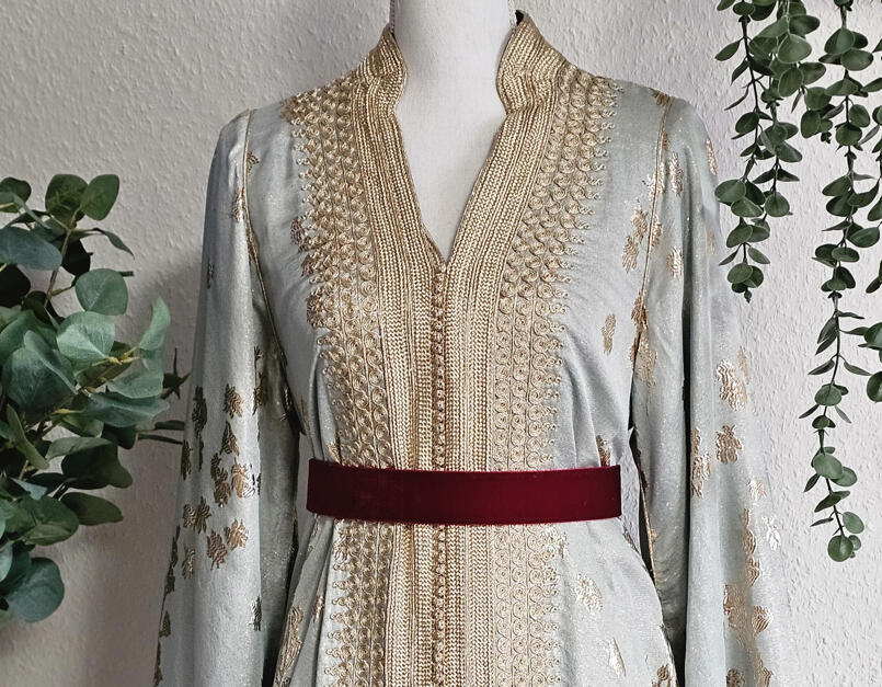This enchanting baby blue kaftan is delicately embroidered with shimmering golden thread, designed on a soft, flowing fabric that exudes grace. The deep burgundy belt provides a bold contrast, making this piece perfect for elegant occasions with a hint of Moroccan heritage.