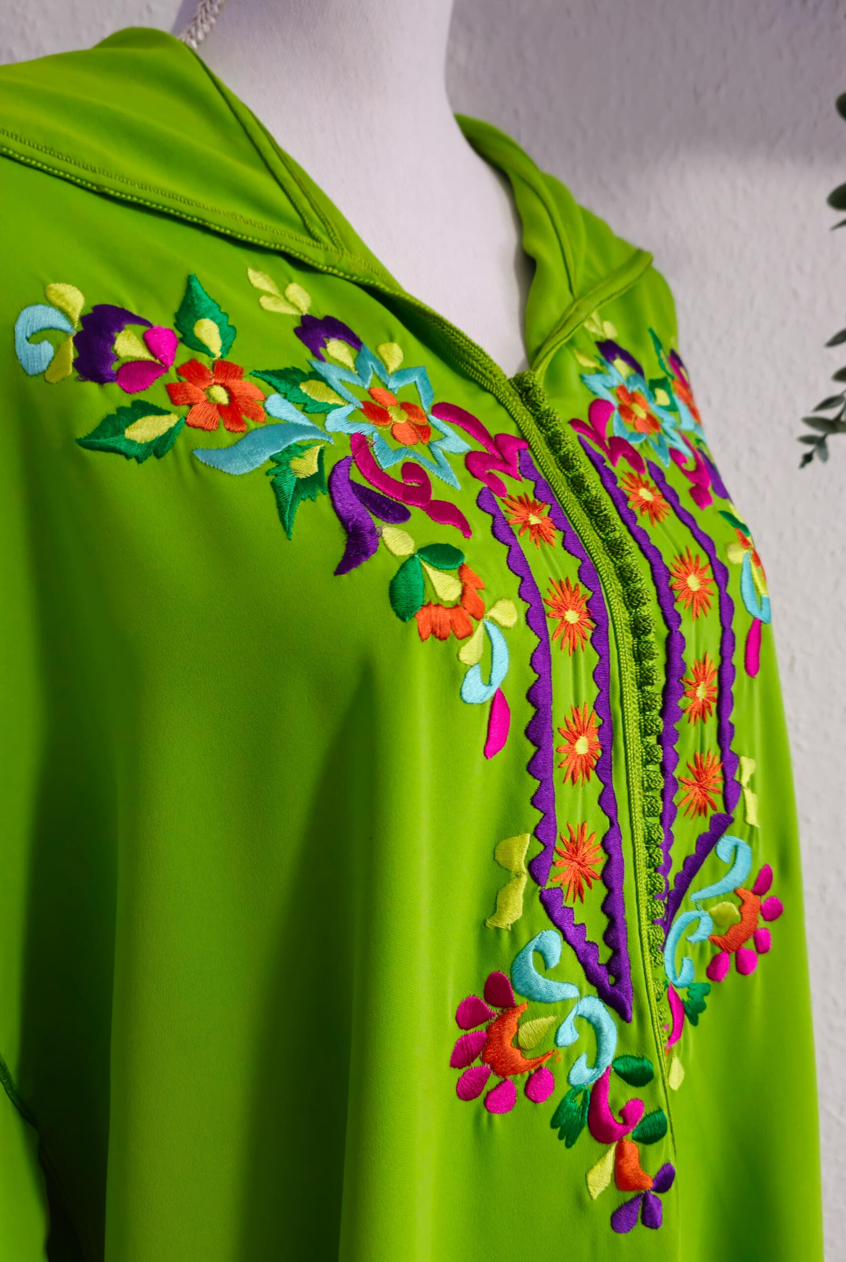 A vibrant green jellaba that blooms with color and confidence. Hand-embroidered with striking floral motifs in bold pink, violet, and ruby red, Flores evokes joy and elegance in every thread. Its lightweight flow and relaxed silhouette offer comfort without compromising on beauty — perfect for summer soirées, brunches, or a statement entrance. Tradition reimagined with modern charm.