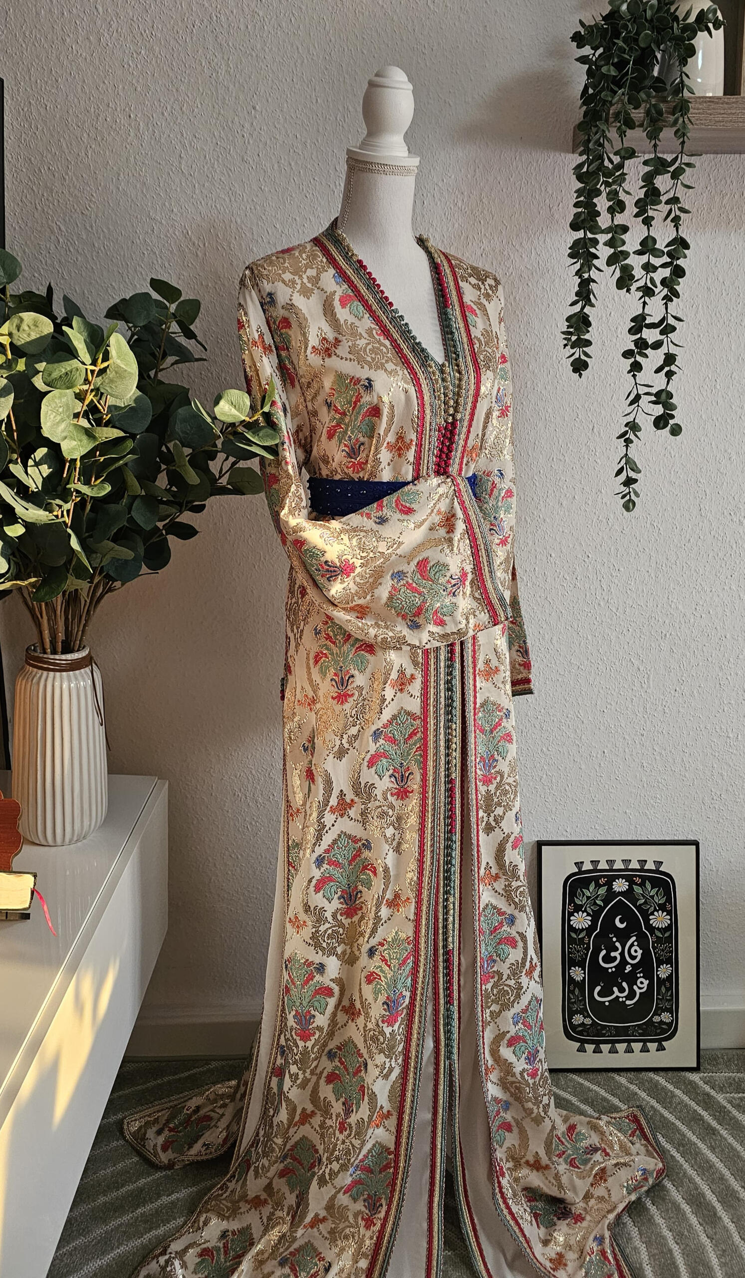 An ode to heritage and craftsmanship, Kaftan Bladi is a regal masterpiece woven with intricate floral motifs in soft gold, emerald, and coral hues. The luxurious brocade fabric shimmers subtly under light, while hand-stitched details and velvet belt evoke timeless Moroccan artistry. Ideal for formal occasions or special celebrations, this piece embodies cultural pride with refined sophistication.
