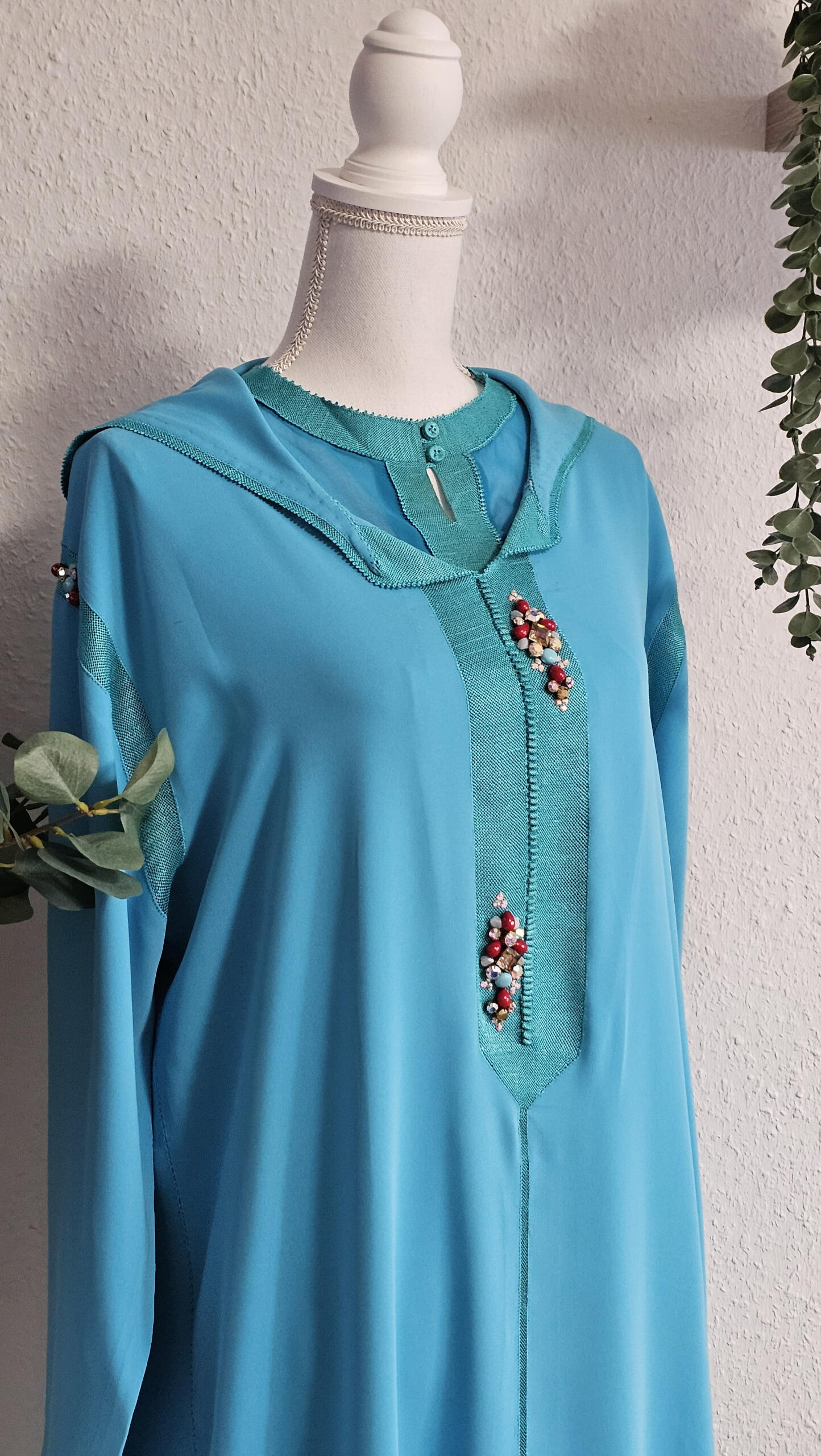 A graceful turquoise jellaba that radiates freshness and ease. Designed with subtle structure and feminine details, it features delicate embellishments of pearl and ruby-toned beads for a playful yet elegant touch. Perfect for daytime elegance or casual evening gatherings, Annissa combines tradition with soft modernity.Renting Price: 69€/Night